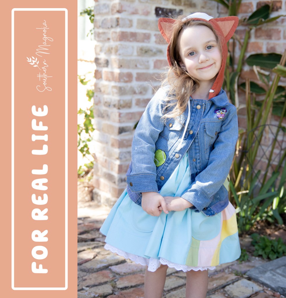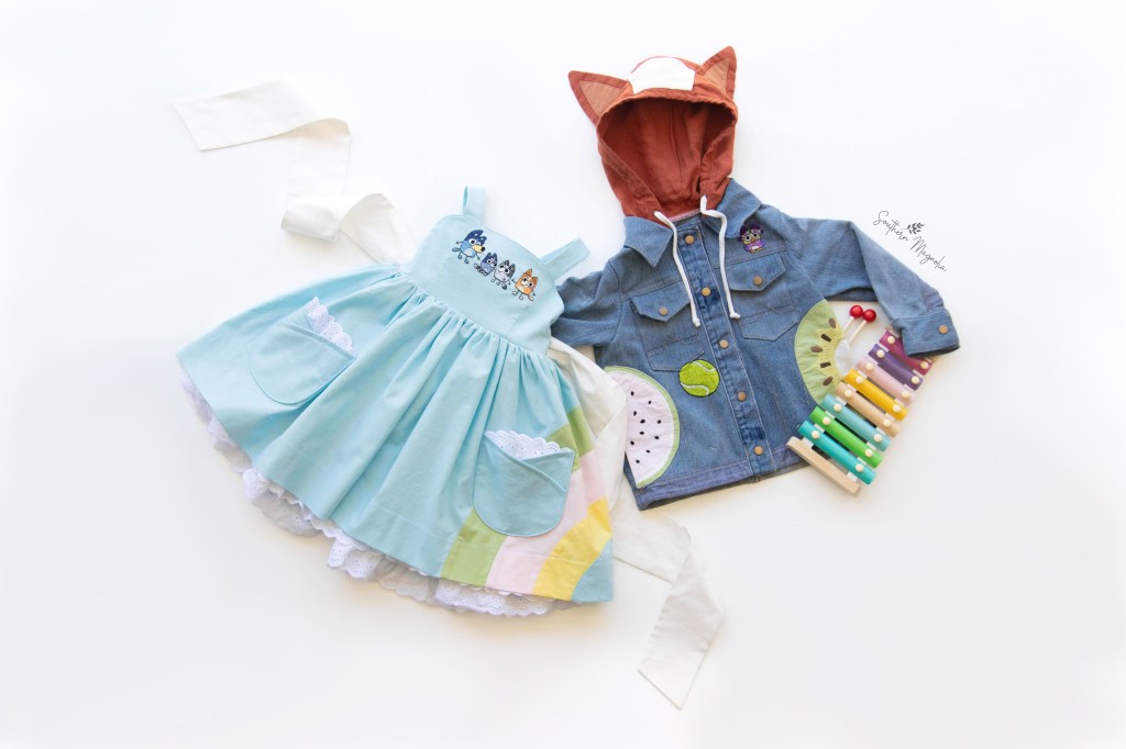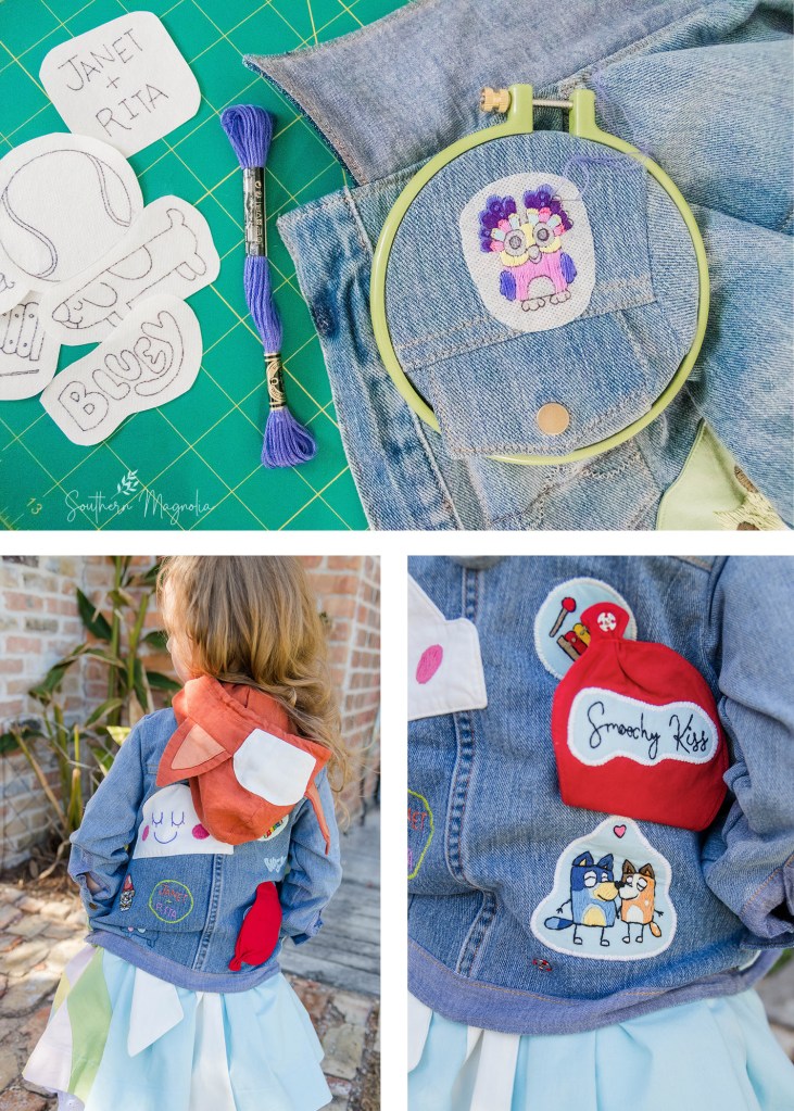 This was such a fun project for me! I enjoyed staying up late watching Bluey with my daughter for “research”, then getting her opinion on what she thought was important to have represented. And I am so grateful for all the bonding time and cuddles that were had while creating this jacket and dress.
