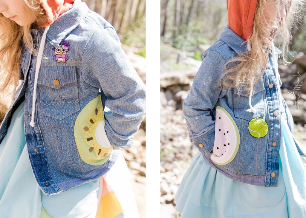 More hand embroidery and handmade patches were added for this fun look, with Ellie making sure to tell me EXACTLY what she wanted to have on her jacket. Images of Chattermax, a garden gnome husband, the magic xylophone, a tennis ball, and the sneaky long dog make their appearances. And at the special request of my daughter, a hidden “smoochy kiss” can be found under the “Keepy Uppy” balloon. She even helped me by embroidering the little heart above the loving couple’s head.