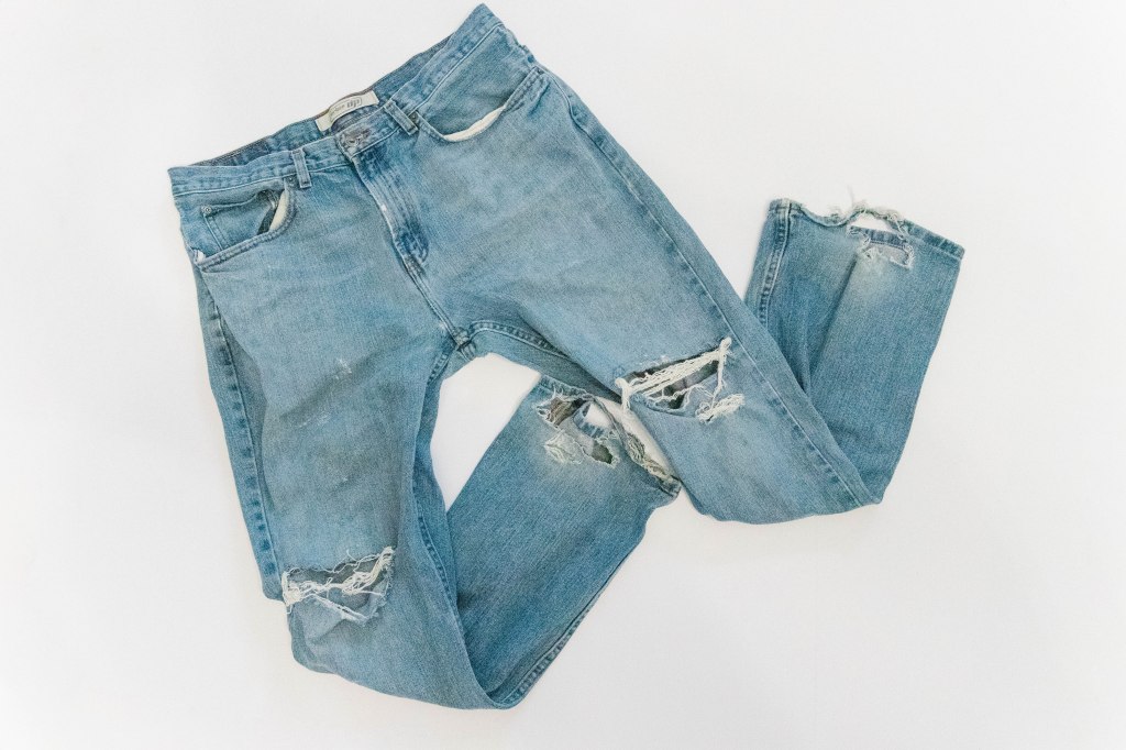 And so began the adventures of creating my very first jean jacket. I upcycled a pair of my husband’s old pants and modified the “Detroit” shacket from Little Lizard King for the pattern. With the size of the holes and worn material in these pants, I had to get a bit creative with my cutting, but thankfully I had just enough useable fabric to work with.