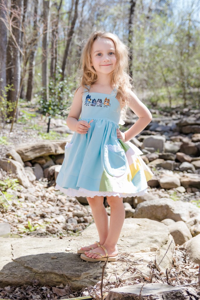I am so excited to share my first design with you all! When I heard that this week’s theme would be all about POCKETS, I knew that I needed to create something fun and functional. My daughter uses her pockets for carrying around all her treasures, and right now, nothing is more loved by her than Bluey. She loves watching the show, reading the books, and playing all the pretend from her favorite episodes.