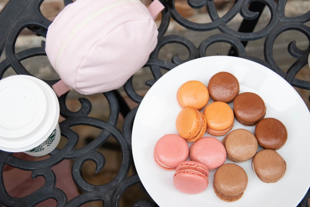 This week was so much fun! I enjoyed thinking outside of the box for a food-themed design, and how to interpret it through fashion. I actually found my inspiration from my oldest son and a homework assignment that we did together. Because he and I love watching The Great British Baking Show, he decided that he wanted his report on French culture to center around their cuisine. And for extra credit, we made French macarons for his teacher and class. I fell in love with the small round pastries, their beautiful pastel colors, and sweet, sugary cream center. Despite the known difficulty of the recipe, I was pleasantly surprised that we were able to make them correctly on our first attempt thanks to this foolproof tutorial I found on Pinterest. I would have loved to make some more for this photoshoot, but since I ran out of time after all the sewing I’d done this week, we had to resort to store-bought.