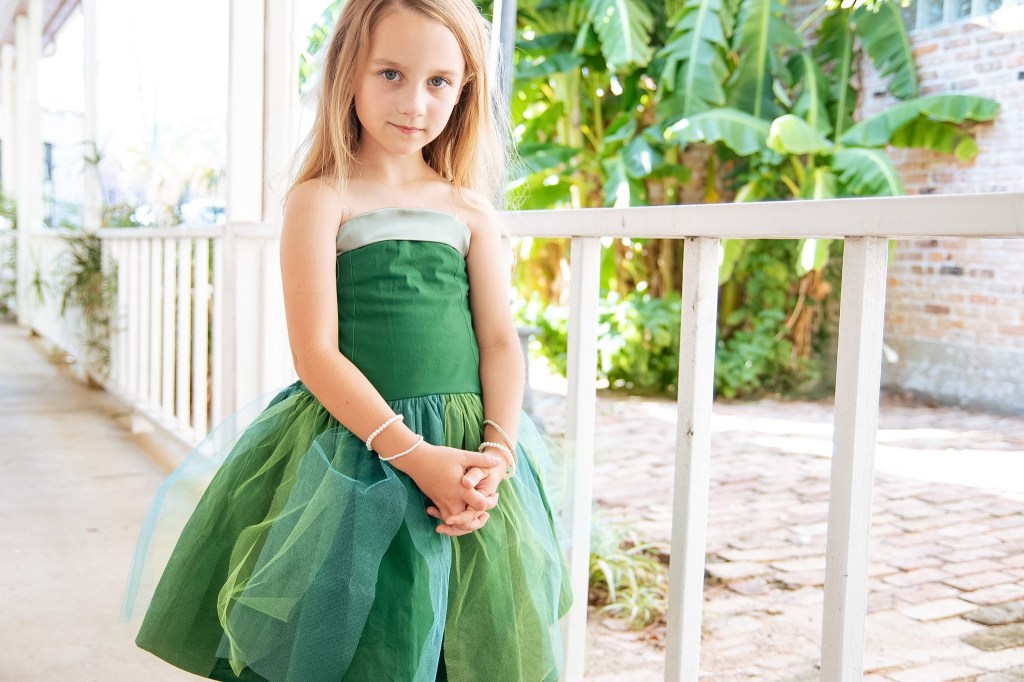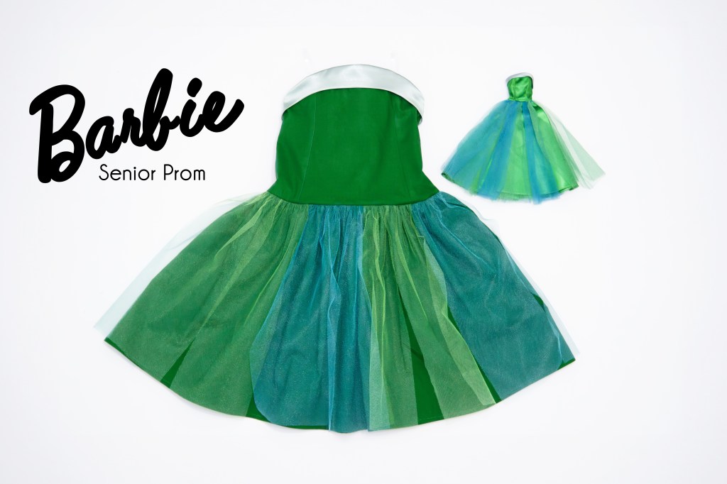 My grandmother was actually a fashion illustrator and doll collector, having many original Barbie dresses in her possession. One that I still own and admire is the 1963 “Senior Prom”. This emerald green gown has a light blue satin on the top bodice, and a tulle overlay in teal blue and green. This dress was one of my favorites to play with when I was growing up. So it seemed only fitting to make my own version for my daughter to wear.