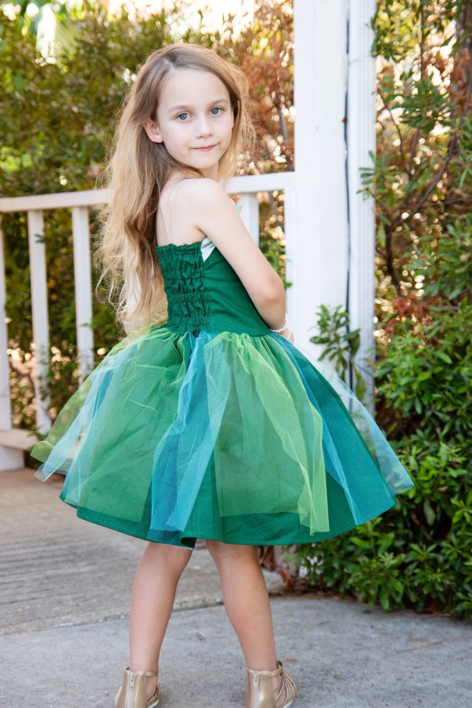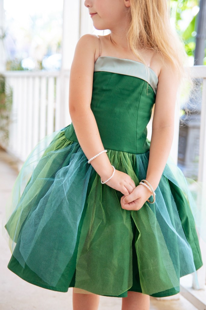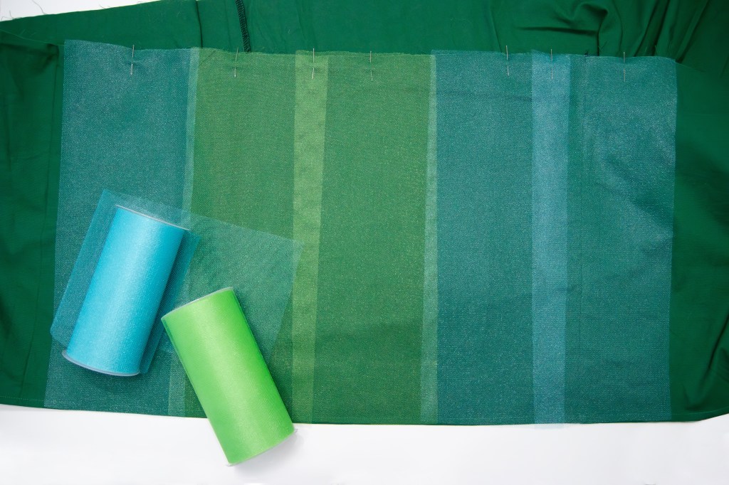 When constructing the skirt, I sewed the “midi length” skirt pieces together and finished the bottom hem. I cut out sections from my rolls of green and blue tulle in the length of the skirt, and then pinned them in alternating columns to the top of the skirt. Making the double row of gathering stitches over all of the layers will hold them in place.