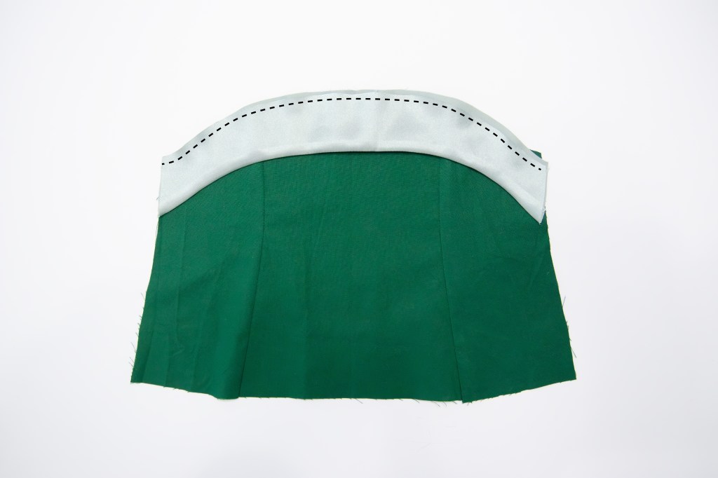 Turning the pieces right side out, I gently ironed the satin flat. The blue satin is then placed on top of the green bodice and carefully basted together along the top edge. Then I followed the standard Camellia tutorial for the rest of the bodice construction. I ended up using a clear elastic in place of the straps to give the appearance of a strapless dress, but I didn’t need to change the length of the straps at all.