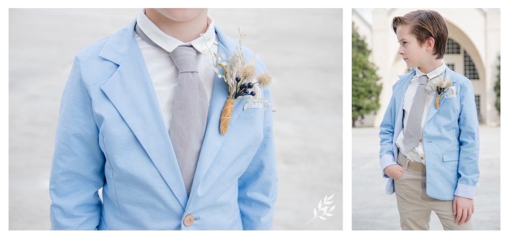 For my son’s outfit, I wanted to go with a very trim and fitted look. His button down shirt was made from Kona cotton (my go-to fabric for ALL the things) using the Hols Shirt pattern. Although you can’t see under the jacket, I did modify it to have short sleeves, because the Texas weather is already moving up to the high 80’s. The pants were repurposed from an old pair of my husband’s khakis and the Sk8 Skinnies pattern. The tie was made using the Outer Space Tie in standard size, but I love how many other options and styles are available in the pattern. I look forward to making some skinny ties and bow ties for my boys. However, the star piece of this ensemble would definitly be the Metro Blazer.