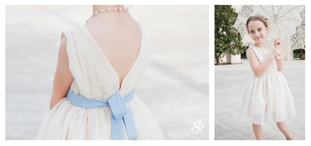 The end result was so soft and elegant in its simple lines and colors. The last touch to her wardrobe was adding a blue sash to the dress in the remnants of the blazer fabric, bringing the two outfits together as a set.